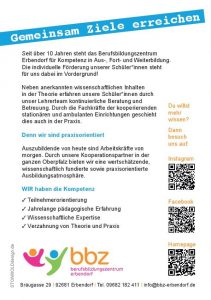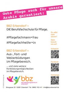 Seit über 10 Jahren steht das Berufsbildungszentrum Erbendorf für Kompetenz in Aus-, Fort- und Weiterbildung im Bereich Generalistische Pflege und Ausbildung in der Heilerziehungspflege. Die individuelle Förderung unserer Schülerinnen und Schüler steht dabei für uns im Vordergrund! Neben anerkannten wissenschaftlichen Inhalten in der Theorie erfahren unsere Schülerinnen und Schüler durch unser Lehrerteam kontinuierliche Beratung und Betreuung, ebenso wie durch die Fachkräfte der kooperierenden stationären und ambulanten Einrichtungen in der Praxis. Wir sind praxisorientiert: Die Auszubildenden von heute sind die Arbeitskräfte von morgen. Durch unsere Kooperationspartner in der ganzen Oberpfalz können wir eine wertschätzende, wissenschaftlich fundierte sowie praxisorientierte Ausbildungsatmosphäre gewährleisten. Wir haben die Kompetenz: Wir fördern und fordern Dich und bleiben auf dem neuesten Stand der Wissenschaft. Bei uns stehst Du im Mittelpunkt.
